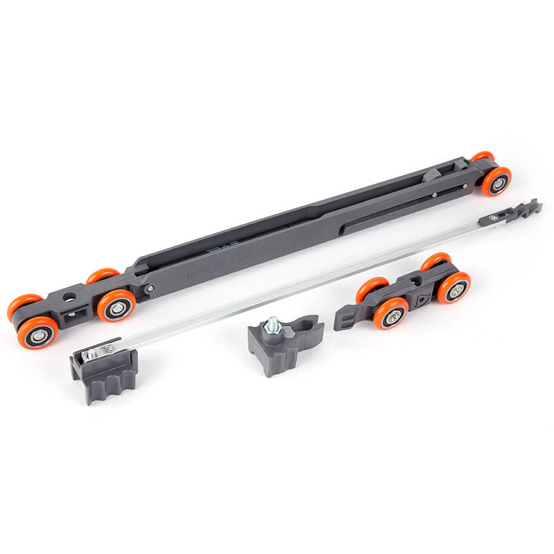 Sistema corredizo de colgar con accesorio cierre suave para puertas de paso que permite realizar distintas configuraciones según necesidad.